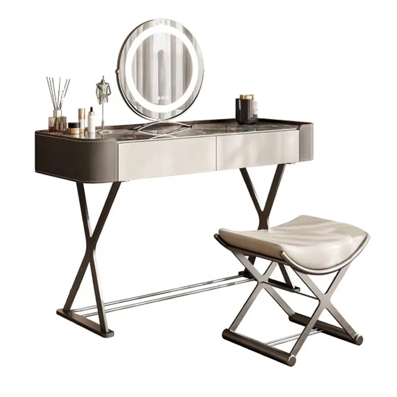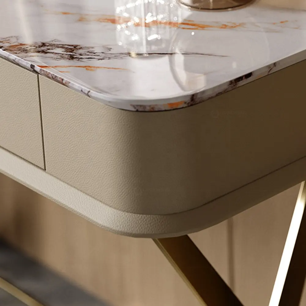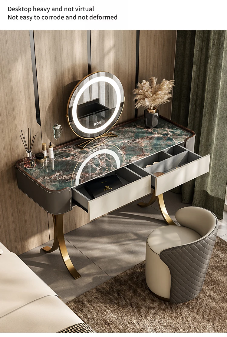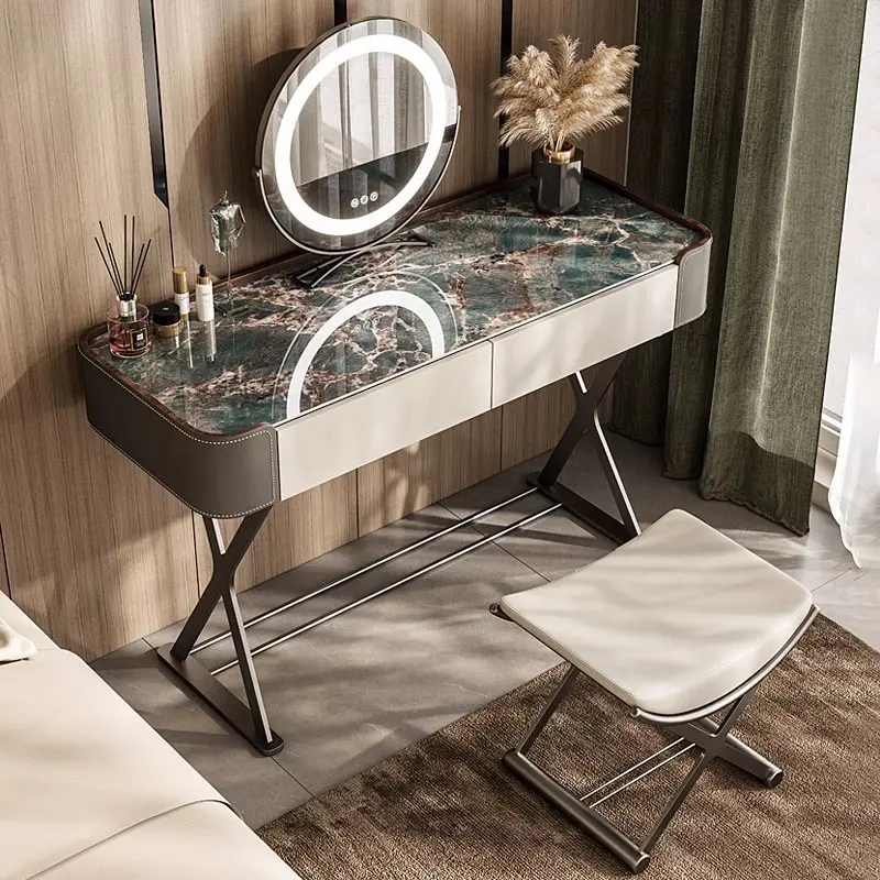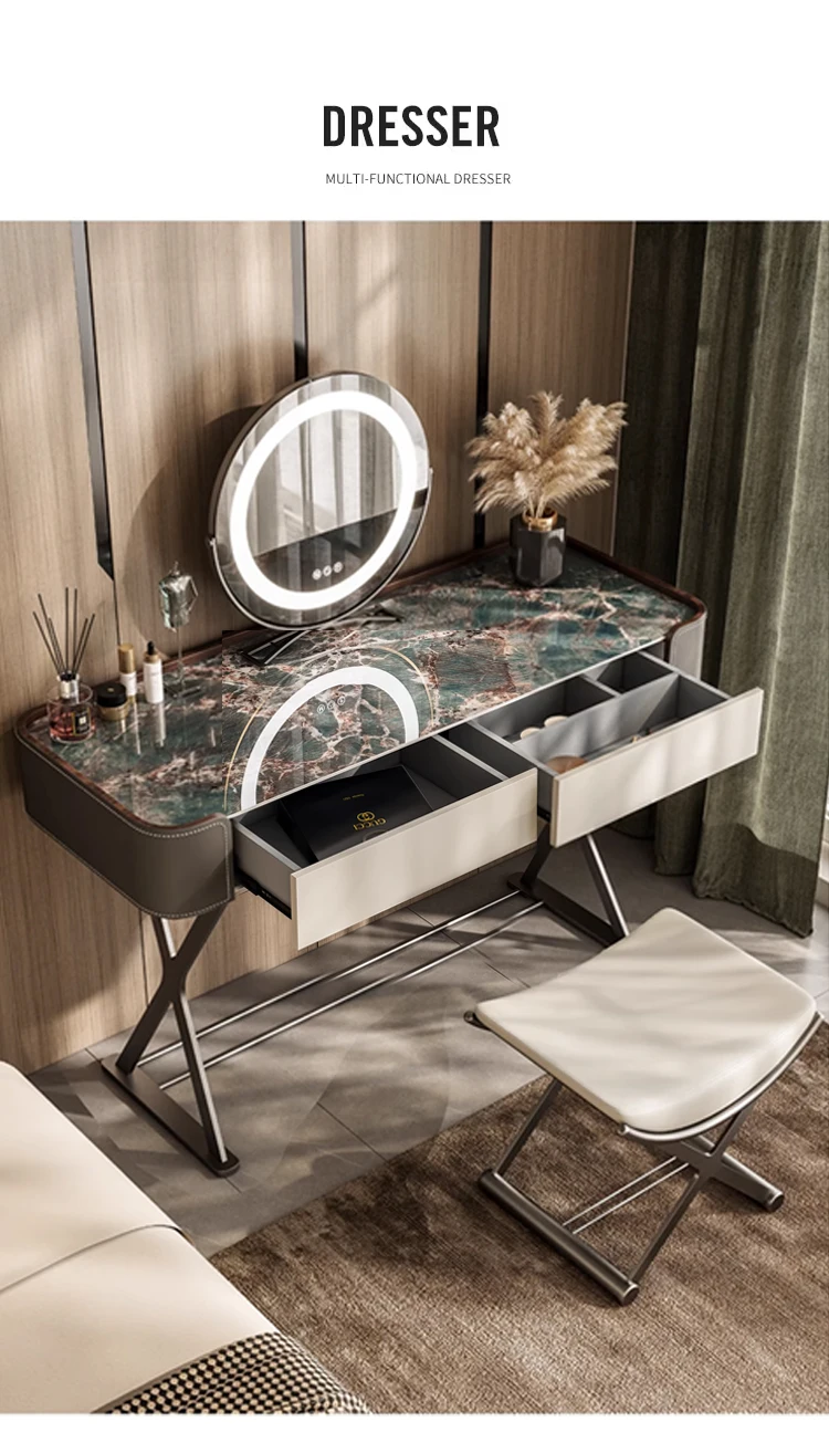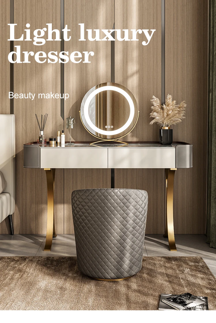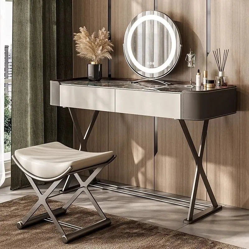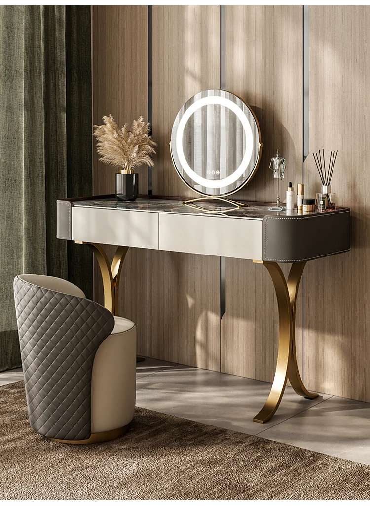 Italian Light Luxury Slate Small Bedroom Dresser with Storage Cabinet Modern Leather And Metal Frame Makeup Table